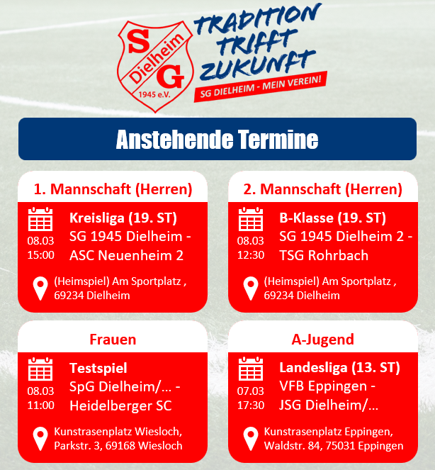 Am kommenden Wochen-ende stehen die ersten Heimspiele des Jahres an. Gestartet wird am Sonntag, um 11 Uhr beim Spiel unserer SG-Frauen in Wiesloch gegen den HSC. Um 12:30 Uhr folgt die Partie auf dem SG-Gelände zwischen unserer SG-Reserve und der TSG Rohrbach. Den Ab-schluss, um 15 Uhr, macht unser Kreisliga-Team gegen die zweite Mannschaft des ASC Neuenheim.